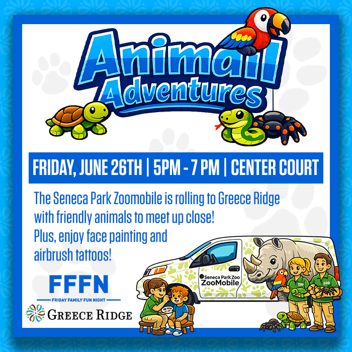 Join us for Animal Adventures at The Mall at Greece Ridge! The Seneca Park ZooMobile will be on site, offerings kids the chance to meet animals and learn more about […]
