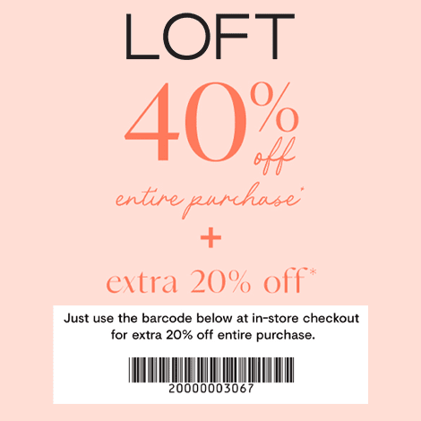 Take 40% off your entire purchase + additional 20% off w/ coupon this weekend at LOFT!